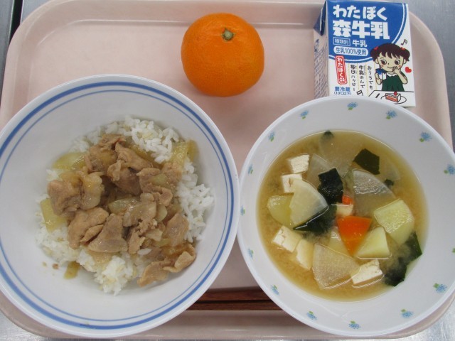 ごはん、豚の生姜焼き、具だくさんみそ汁、みかん、牛乳