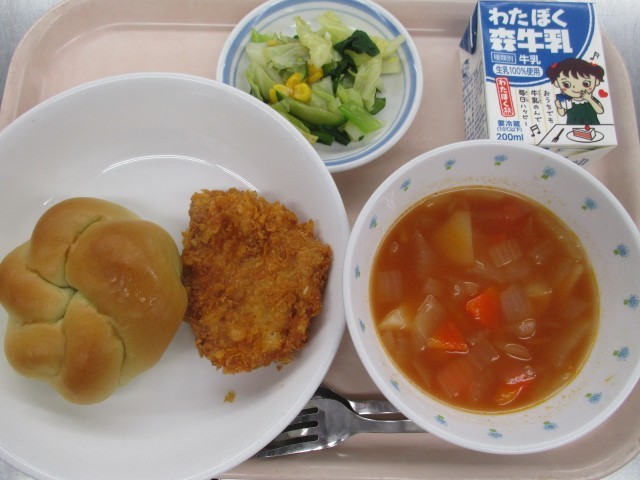 あしたばパン、パリパリチキン、グリーンサラダ、ミネストローネ、牛乳