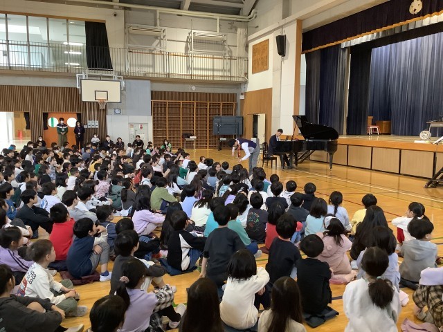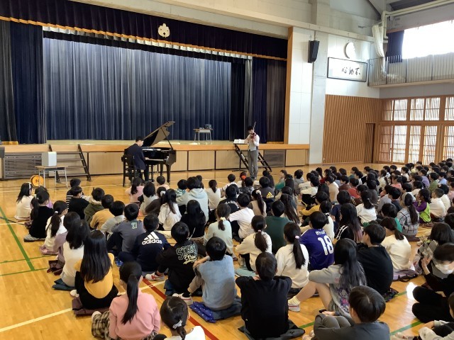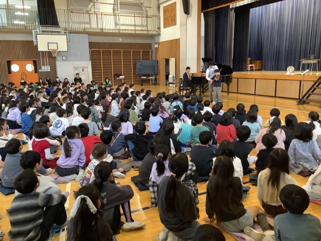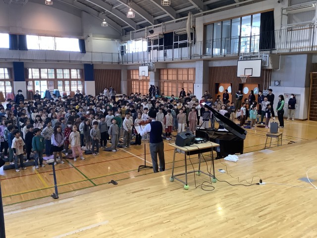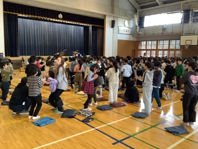 12月25日【1・2・3年生】音楽 公開日 2025/12/25 更新日 2025/12/25 校長日記 今日が年内最終登校日です。音楽グループ「エバリー」のメンバーの方に来ていただき、ミニコンサートを開催してもらいました。演奏を聴くだけでなく、楽器を体験させていただいたり、手拍子や掛け声で演奏に参加したり、楽しいすてきな時間になりました。最後は校歌を演奏してくださり、みんなで斉唱しました。エバリーのお二人様、今日は本当にありがとうございました。 +2 いいね(0)