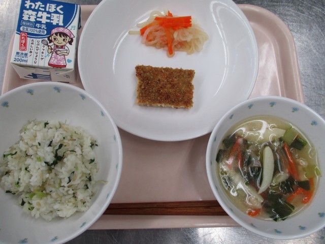青菜ごはん、松風焼き、紅白なます、すまし汁、牛乳