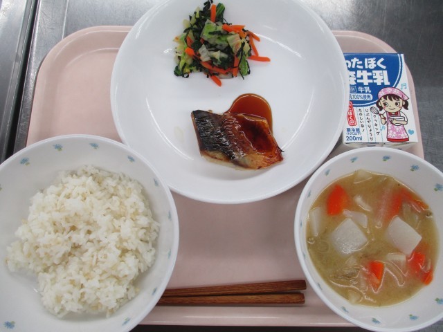 ごはん、さば照り焼き、のりあえ、田舎汁、牛乳