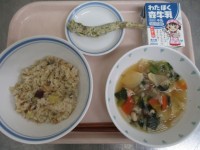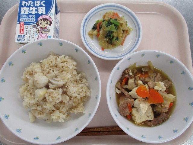 1月20日 給食 公開日 2026/01/20 更新日 2026/01/20 給食 ★こんだて★鯛めし、肉豆腐、ごまあえ、牛乳今日は開校記念日なので、お祝いの気持ちで「鯛めし」を提供しました。うまみたっぷりの鯛めしでした☺★産地★真鯛(宮城)たまねぎ(北海道)こんにゃく(群馬)豚肉(茨城)ねぎ(栃木)焼き豆腐(愛知・佐賀)にんじん(千葉)キャベツ(愛知)小松菜(東京) いいね(0)