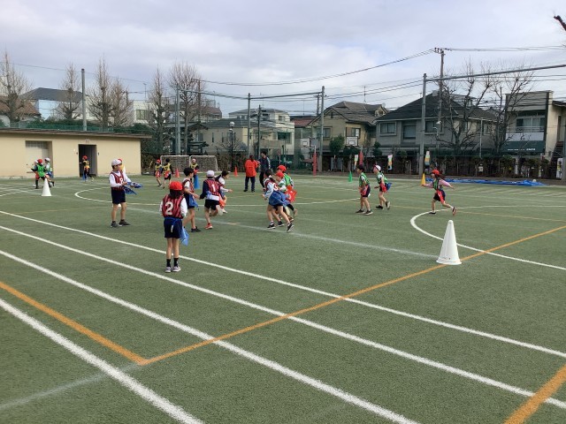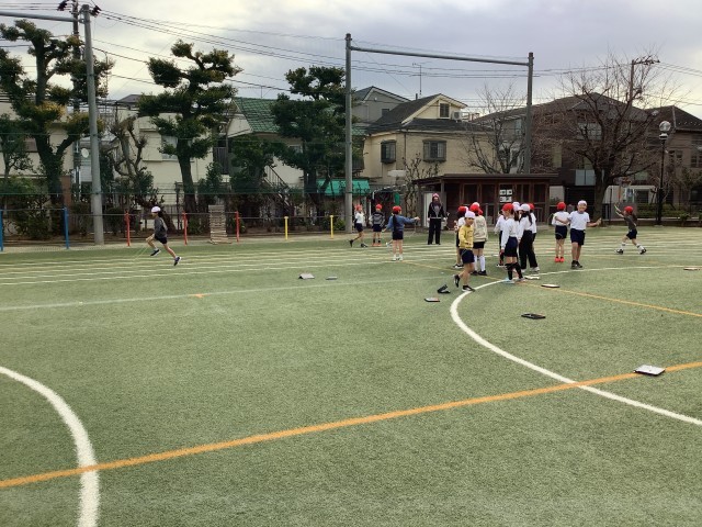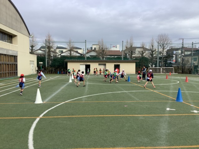 今日は一段と寒さが厳しいですが、1時間目から校庭で体育を頑張っていました。1組は縄跳び、2組はフラッグフットボールに取り組んでいました。