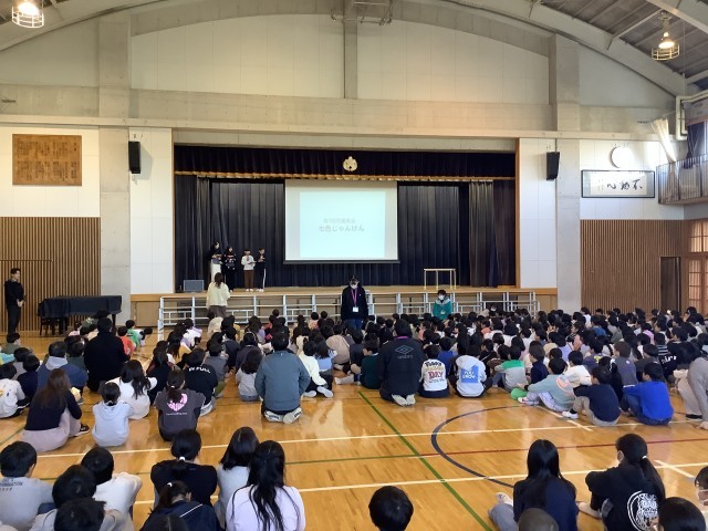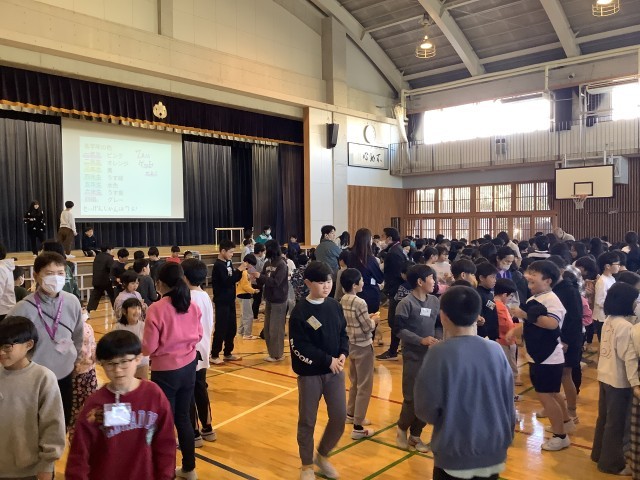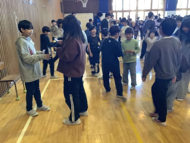 今日の児童集会は集会委員会が企画した「七色ジャンケン大会」でした。1〜6年生と4くみで色違いの手作り名刺カードを持ちます。いろいろな学年とジャンケンをして勝つとカードがもらえます。みんな何色そろったかな。楽しそうに活動していました。