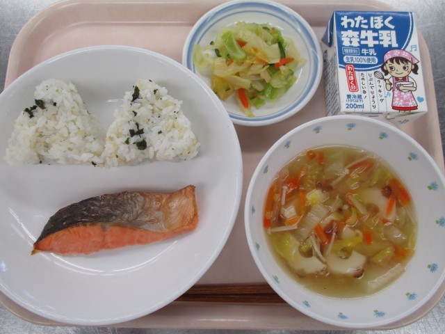 わかめおにぎり、鮭の塩焼き、変わり漬け、ちゃんこ汁、牛乳