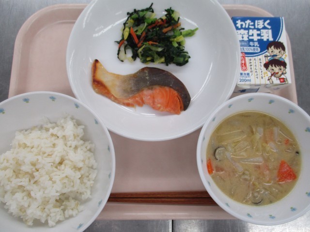 ごはん、鮭の西京焼き、のり和え、利休汁、牛乳