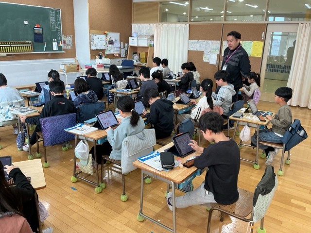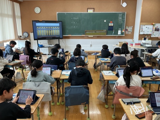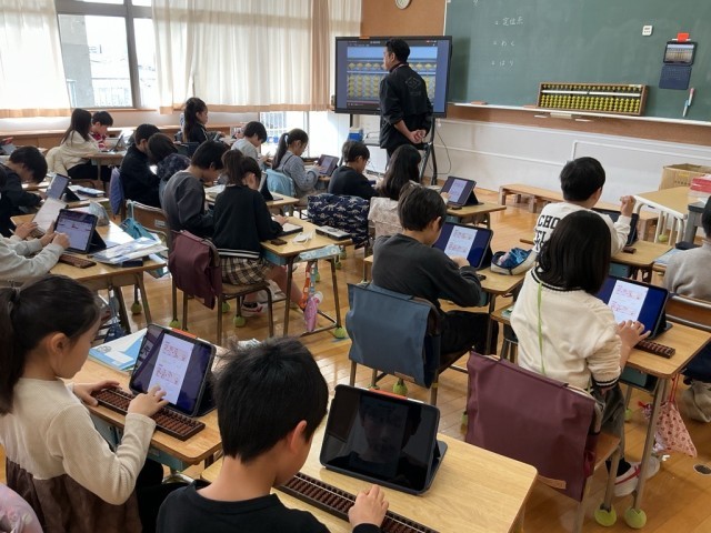 「そろばん」の学習です。『そろばんは、古くから我が国で用いられている計算のための道具であり、数を表したり、計算したりするのに便利な物である。』(学習指導要領より抜粋)机の上に、そろばんとタブレット端末・・・。新旧の学習用具が並んでいました。