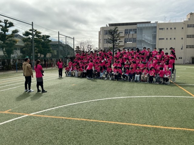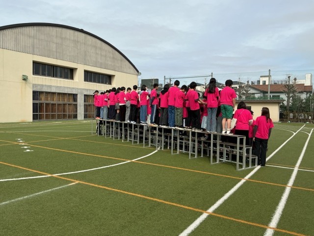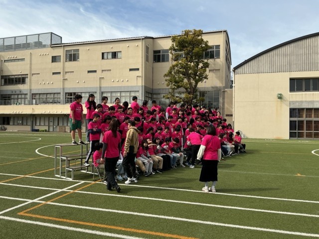 卒業アルバムに掲載される学年合同写真の撮影です。運動会で着用したおそろいのTシャツで写真を撮っていました。