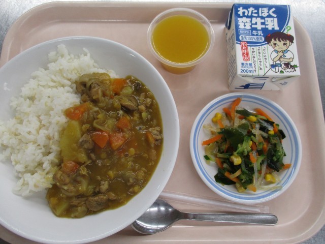 4月9日 給食 公開日 2026/04/10 更新日 2026/04/10 給食 ★こんだて★カレーライス、海藻サラダ、オレンジゼリー、牛乳今日は1年生にとって初めての給食でした。カレーもサラダもよく食べてくれていて、おいしかったという声も聞くことができました♪ いいね(0)