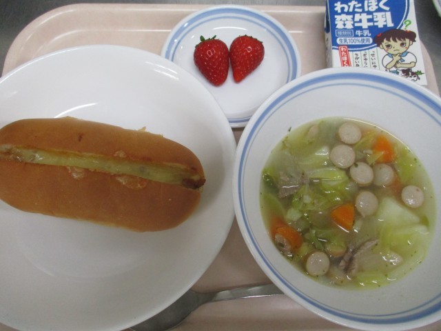 4月10日 給食 公開日 2026/04/10 更新日 2026/04/10 給食 ★こんだて★ツナピザドッグ、ポトフ、いちご、牛乳デザートのいちごが甘くておいしかったです。各クラス、おかわりじゃんけんで盛り上がっていました☺ いいね(2)