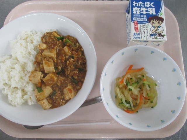 4月14日 給食 公開日 2026/04/14 更新日 2026/04/14 給食 ★こんだて★マーボー豆腐丼、大根のサラダ、牛乳1年生もだんだんと給食当番のお仕事や配膳に慣れてきた様子でした☺ いいね(1)