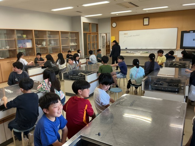 5年生から家庭科の学習が始まりました。ガスコンロの使い方を教わり、火をつける、消す、火加減を調節する体験をしていました。おっかなびっくりの子もいましたが、みんなしっかりできていました。