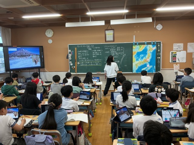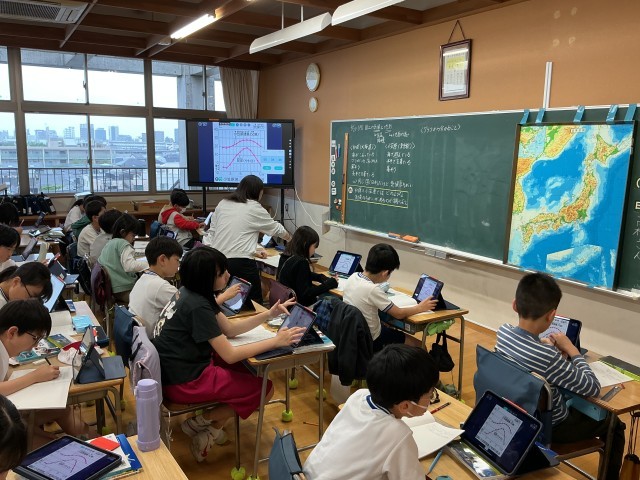 「国土の気候と地形」についての学習です。写真やグラフなどを見比べてこれから調べていく学習問題を考えていました。落ち着いて学習に取り組んでいました。