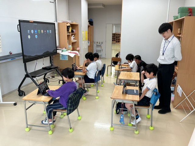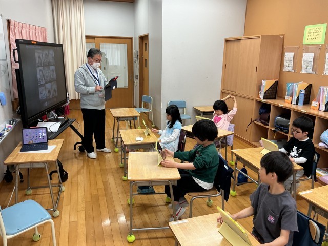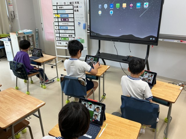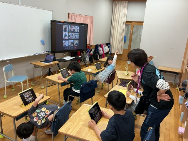 ICT支援員の先生に見てもらいオンライン体験をしていました。画面の向こうからクイズを出してもらったり、指示通り身体を動かしたりしていました。楽しみながら取り組んでいました。