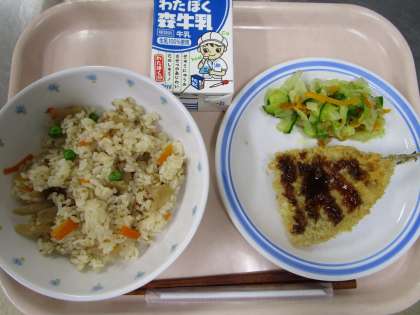 きんぴらご飯は、きんぴらを炒め煮したものをしょうゆを加えて炊いたご飯と混ぜています。グリンピースが苦手、という子も見られましたが、頑張って食べてくれている子もいました。少しずつ慣れていってくれたら良いなと思います。