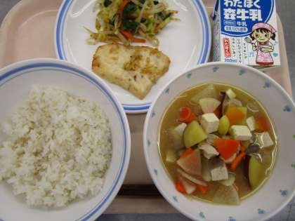 今日のさつま汁には、石川県金沢市で栽培されている五郎島金時という品種のさつまいもを使いました。五郎島金時は11月ごろに収穫の時期を迎えますが、貯蔵している間に甘味が増してこの時期にもおいしく食べられます。五郎島金時のほど良い甘みが感じられるさつま汁になりました。具沢山のさつま汁になりましたが、どのクラスもよく食べていました。