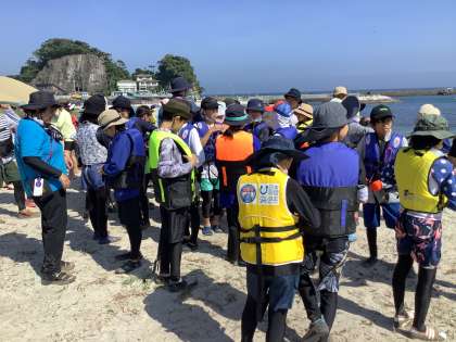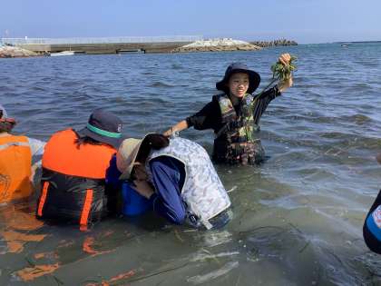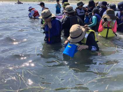 7月10日【6年生・興津】 公開日 2023/07/10 更新日 2023/07/10 校長日記 あおも観察。ライフジャケットを着用して海に入ります。腰くらいまで海につかり箱眼鏡を使って観察です。あおもが自生しているのは水がきれいな証だそうです。 いいね(0)