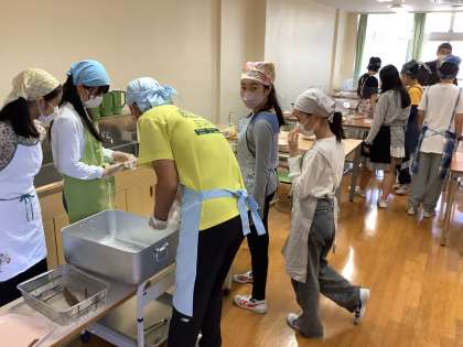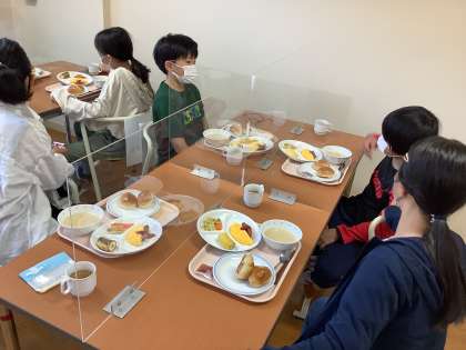 学園で食べる最後の食事です。食事係も毎回の準備、片付け頑張りました。食事を作ってくれた職員の方に感謝して残さず食べましょう。「いただきます。」