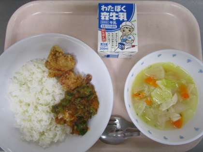 令和5年7月14日(金) 公開日 2023/07/14 更新日 2023/07/14 給食 ー今日の給食ー ・ごはん ・オクラチキン ・レンティルスープ ・牛乳 ー食材の産地紹介ー たまねぎ(兵庫県) オクラ(鹿児島県) トマト(青森県) ピーマン(茨城県) だいこん(北海道) パセリ(千葉県) いいね(0)