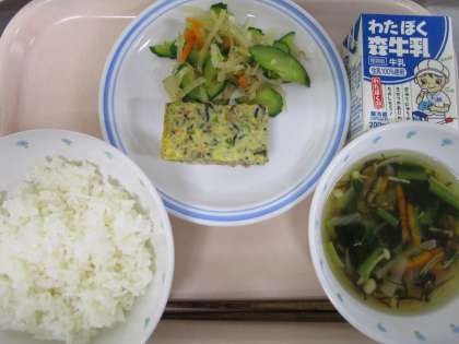 令和5年7月18日(火) 公開日 2023/07/19 更新日 2023/07/19 給食 ー今日の給食ー ・ごはん ・ひじき入り卵焼き ・きゅうりとだいこんのサラダ ・もずく入りスープ ・牛乳 ー食材の産地紹介ー にんじん(青森県) さやえんどう(北海道) きゅうり(青森県) だいこん(青森県) えのき(長野県) こまつな(東京都) いいね(0)