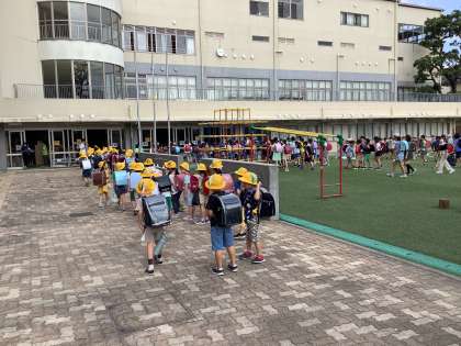 今朝の登校風景です。連日の猛暑もあってか子どもたち若干疲れ気味の様子でした。あいさつにちょっと元気のない子が多かったです。さあ、今日は4時間授業です。頑張りましょう!!