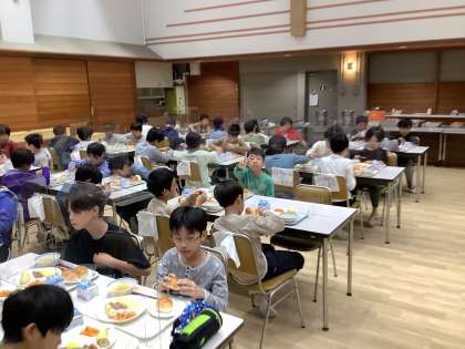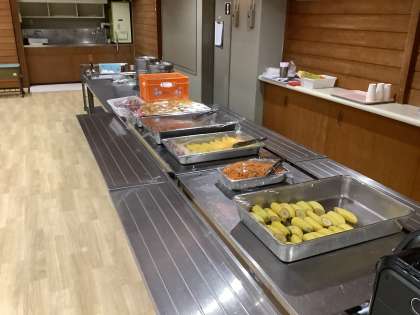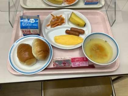 3日目の朝食です。今日はパンです。今朝もおかわりをたくさん用意していただいています。たくさん食べましょう。「いただきます。」