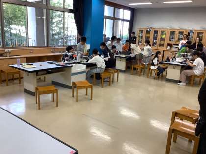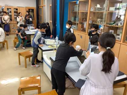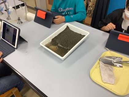 流れる水の働きと土地の変化について理科室で実験中です。実験からどんなことがわかったかな?
