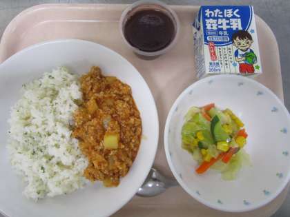 令和5年11月2日(木) 公開日 2023/11/02 更新日 2023/11/02 給食 ー今日の給食ー ・パセリライス&むろあじのミートソース ・コーンサラダ ・ぶどうゼリー ・牛乳 ー食材の産地紹介ー じゃがいも(北海道) にんにく(青森県) たまねぎ(北海道) にんじん(北海道) きゅうり(岩手県) きゃべつ(東京都) いいね(0)