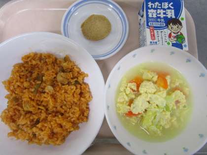 令和5年11月7日(火) 公開日 2023/11/07 更新日 2023/11/07 給食 ー今日の給食ー ・チキンライス ・洋風卵スープ ・クッキー ・牛乳 ー食材の産地紹介ー たまねぎ(北海道) ピーマン(茨城県) ねぎ(青森県) にんじん(千葉県) きゃべつ(千葉県) セロリ(長野県) いいね(0)