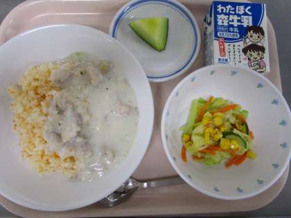 令和6年5月16日(木) 公開日 2024/05/16 更新日 2024/05/16 給食 ー今日の給食ー ・キャロットライスのクリームソースかけ ・コーンサラダ ・メロン ・牛乳 ー食材の産地紹介ー にんじん(千葉県) たまねぎ(兵庫県) しょうが」(高知県) エリンギ(新潟県) きゅうり(宮崎県) きゃべつ(茨城県) いいね(0)