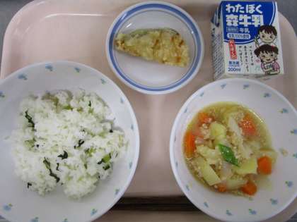 令和6年5月17日(金) 公開日 2024/05/17 更新日 2024/05/17 給食 ー今日の給食ー ・青菜ごはん ・白身フライ ・野菜のそぼろ煮 ・牛乳 ー食材の産地紹介ー こまつな(埼玉県) にんじん(千葉県) たまねぎ(兵庫県) じゃがいも(長崎県) さやえんどう(栃木県) いいね(0)