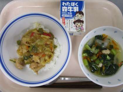令和6年5月23日(木) 公開日 2024/05/23 更新日 2024/05/23 給食 ー今日の給食ー ・肉野菜丼 ・青菜のスープ ・牛乳 ー食材の産地紹介ー にんにく(青森県) たまねぎ(兵庫県) にんじん(千葉県) 赤ピーマン(宮崎県) ピーマン(茨城県) きゃべつ(神奈川県) こまつな(埼玉県) いいね(0)