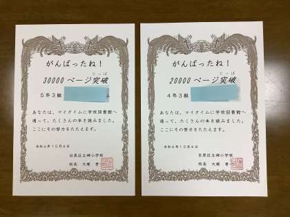 10月4日【学校図書館】 公開日 2024/10/04 更新日 2024/10/04 校長日記 昨日に引き続き賞状です。20000ページ突破が1人と30000ページ突破が一人です。すごい。 いいね(0)