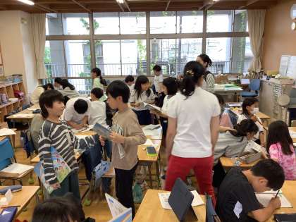 「What's do you like 〜?」好きな食べ物やキャラクター等について友達に英語で質問をしていました。