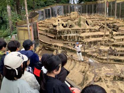猿山を見学中。飼育員の方が質問に答えてくれました。