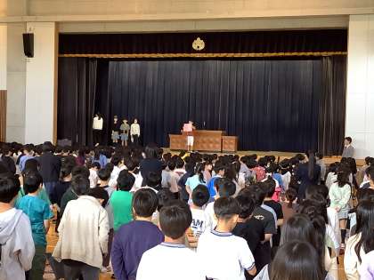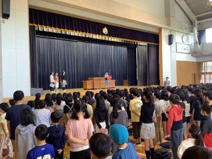 体育館で終業式を行いました。時間前に全員が集まり、静かに整列できていました。立派です。2年生と4年生の代表児童が前期、頑張ったことを発表してくれました。堂々と発表する姿が凛々しかったです。聞いている子どもたちの態度も立派でした。