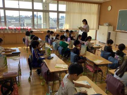教科書も下巻の学習が始まりました。「くじらぐも」の学習です。全文を聞いて、おおまかな内容を聞き取っていました。