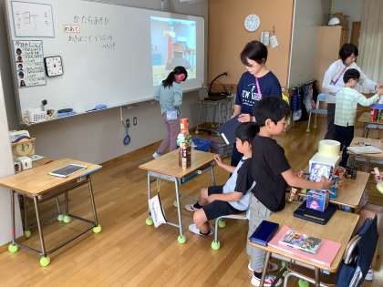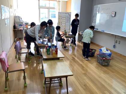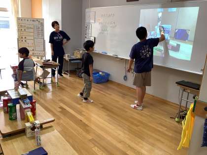 「かたちあそび」身の回りのものの形に着目し、楽しみながら立体図形に親しんでいました。