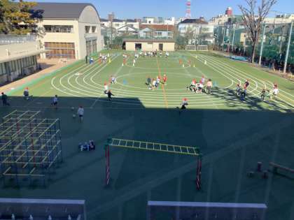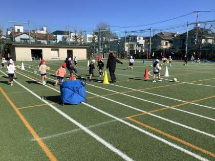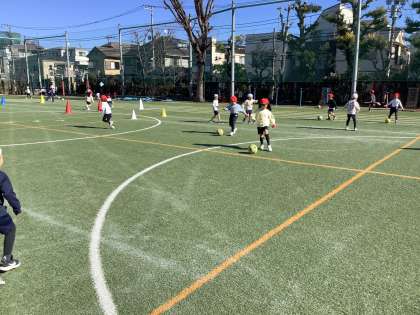 「ボールゲーム」ボールを蹴って運んだり、ボールを止めたりするボール操作と攻めと守りに分かれてゲームをしていました。たくさん体を動かしていました。写真は、1組と2組です。