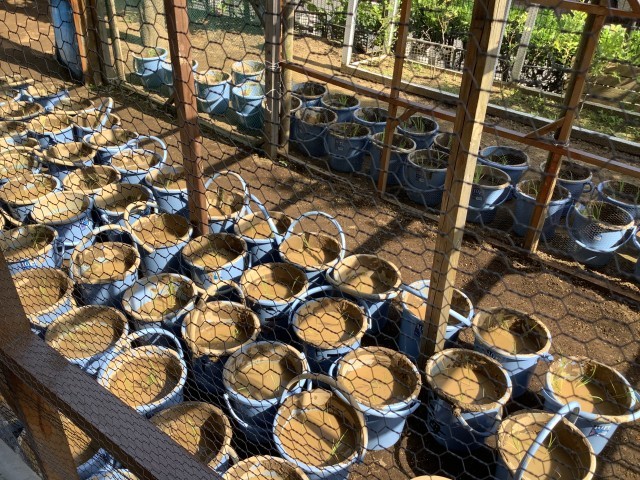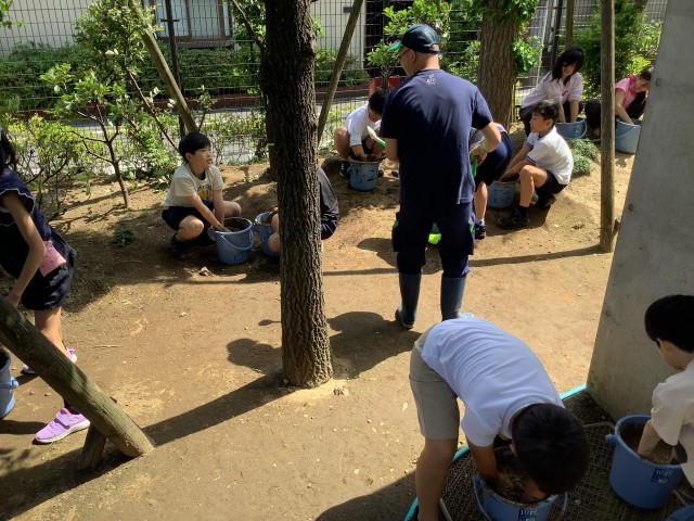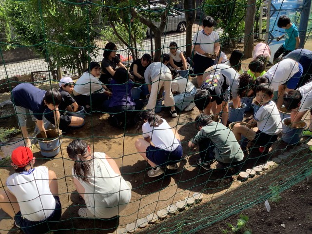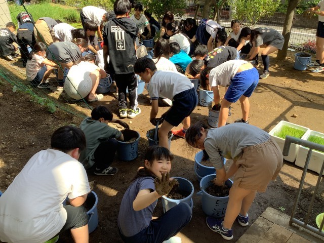 5月20日【5年生】チャレンジタイム 公開日 2025/05/20 更新日 2025/05/20 校長日記 パルシステムの方をゲストティーチャーにお招きしてバケツイネづくりに挑戦です。「しろかき」をしてバケツに水をはって、いただいた苗を植えます。田植えです。 +4 いいね(1)