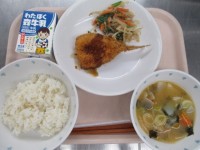 ★こんだて★ごはん、あじフライ、ごまあえ、田舎汁、牛乳★産地★あじ(鳥取)にんじ...