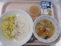 ★こんだて★カレーピラフきのこソース、ホールコーンスープ、ももゼリー、牛乳★産地...
