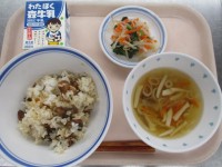 ★こんだて★とうもろこしごはん、かつおと豆のごまがらめ、沢煮椀、牛乳★産地★コー...