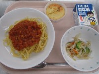 ★こんだて★スパゲティミートソース、レモンサラダ、ブルーベリーケーキ、牛乳★産地...
