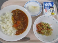 ★こんだて★ハヤシライス、ゆで野菜ごまソース、梨、牛乳★産地★にんにく(青森)た...