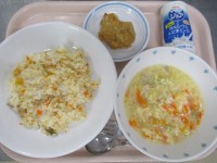 ★こんだて★煮豚と青菜のチャーハン、わかめスープ、さつまいもチップス、牛乳★産地...