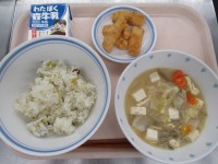 ★こんだて★煮豚と青菜のチャーハン、わかめスープ、さつまいもチップス、牛乳★産地...