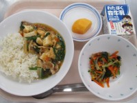 ★こんだて★ごはん、わかさぎのカレーあげ、もやしの甘酢、芋煮、牛乳※写真は中学年...