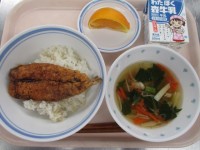 ★こんだて★いわしのかば焼き丼、沢煮椀、でこぽん、牛乳★産地★いわし(国産)しょ...