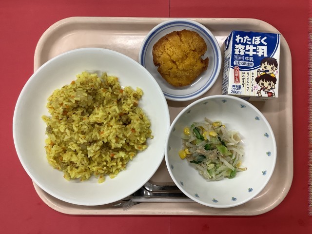 今日の給食 牛乳 カレーピラフ こまツナサラダ パンプキンドーナッツ 主な食材の産地> 鶏肉(国産) 卵(青森) 精白米(秋田) 玄米(秋田) にんにく(青森) 玉ねぎ(北海道) にんじん(北海道、青森、茨城) 緑豆もやし(静岡) キャベツ(群馬) 大根(青森) 冷凍ホールコーン(北海道) 小松菜(茨城) かぼちゃ(北海道)